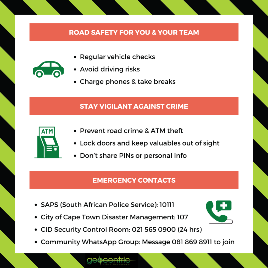 Invest in reputable security or armed response services, and stay connected to community information channels such as WhatsApp groups or neighbourhood watch networks. - Fire safety matters: